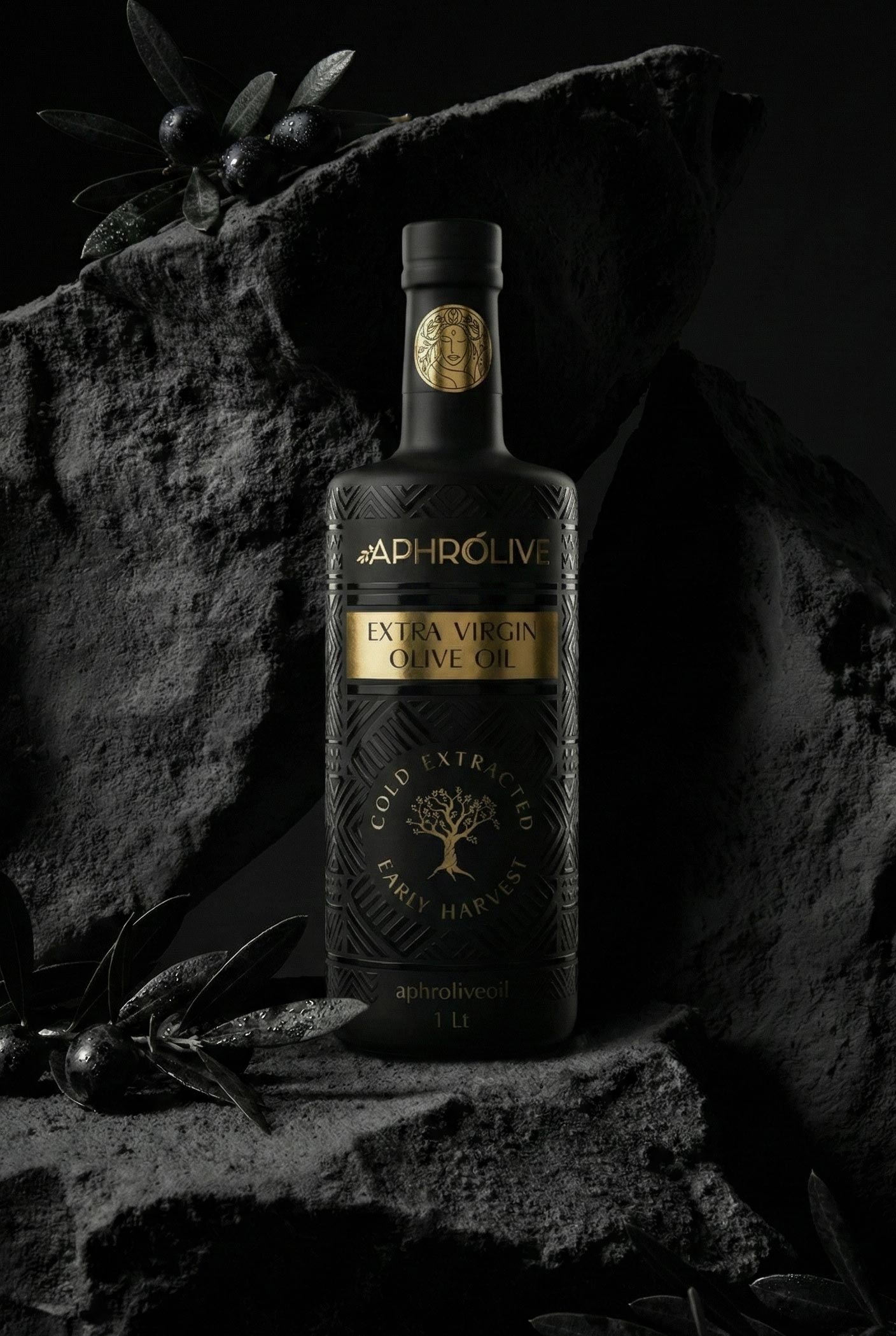 In this project for Aphrolive, I crafted an end-to-end brand experience, ranging from logo design to the bottle’s structure. The Aphrodite-inspired logo with its gold details creates a premium perception by contrasting with the textured surface of the matte black bottle. Distinguishing itself from traditional olive oil packaging, this design offers both visual and tactile luxury, giving the Aegean’s ‘liquid gold’ the value it deserves.